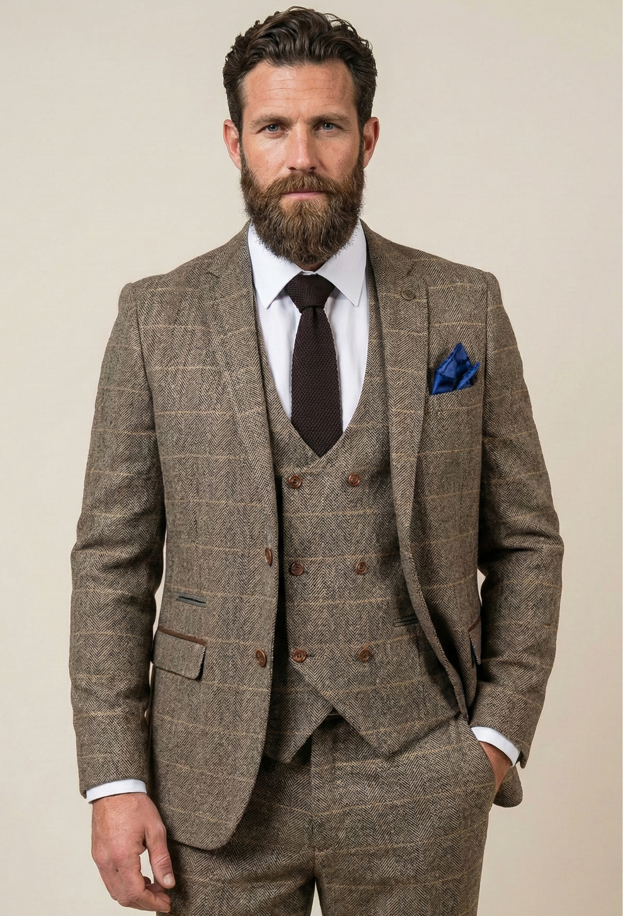 Die Passform dieses dreiteiligen Anzugs? Gemacht für den modernen Mann. Schlank, aber nicht zu eng – ein Schnitt, der die Figur betont, ohne einzuengen. Die Linien sind klar, die Schultern markant, die Taille sitzt perfekt. Das Ergebnis: eine Silhouette, die Klasse und Stärke ausstrahlt. Das Karomuster auf dem Gilet sorgt für die gewisse englische Finesse, als kämest du direkt aus einem exklusiven Londoner Club, umgeben von Mahagonibücherschränken und glänzenden Tischen voller Geschichten.