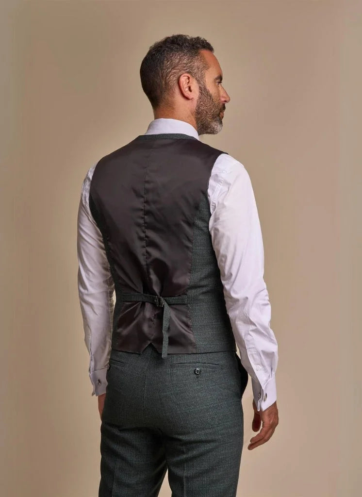 Die olivgrüne Farbe dieser Weste ist elegant und vielseitig, was sie zu einer großartigen Ergänzung für jede Garderobe macht. Das Karomuster und die schwarzen Knöpfe verleihen der Weste eine zusätzliche Note von Klasse. Diese Details machen die Weste sowohl für formelle als auch für legere Anlässe geeignet. Ob du zu einer Hochzeit gehst oder ein Geschäftstreffen hast, die Cavani Caridi - Weste Olivgrün passt perfekt zu jeder Situation.