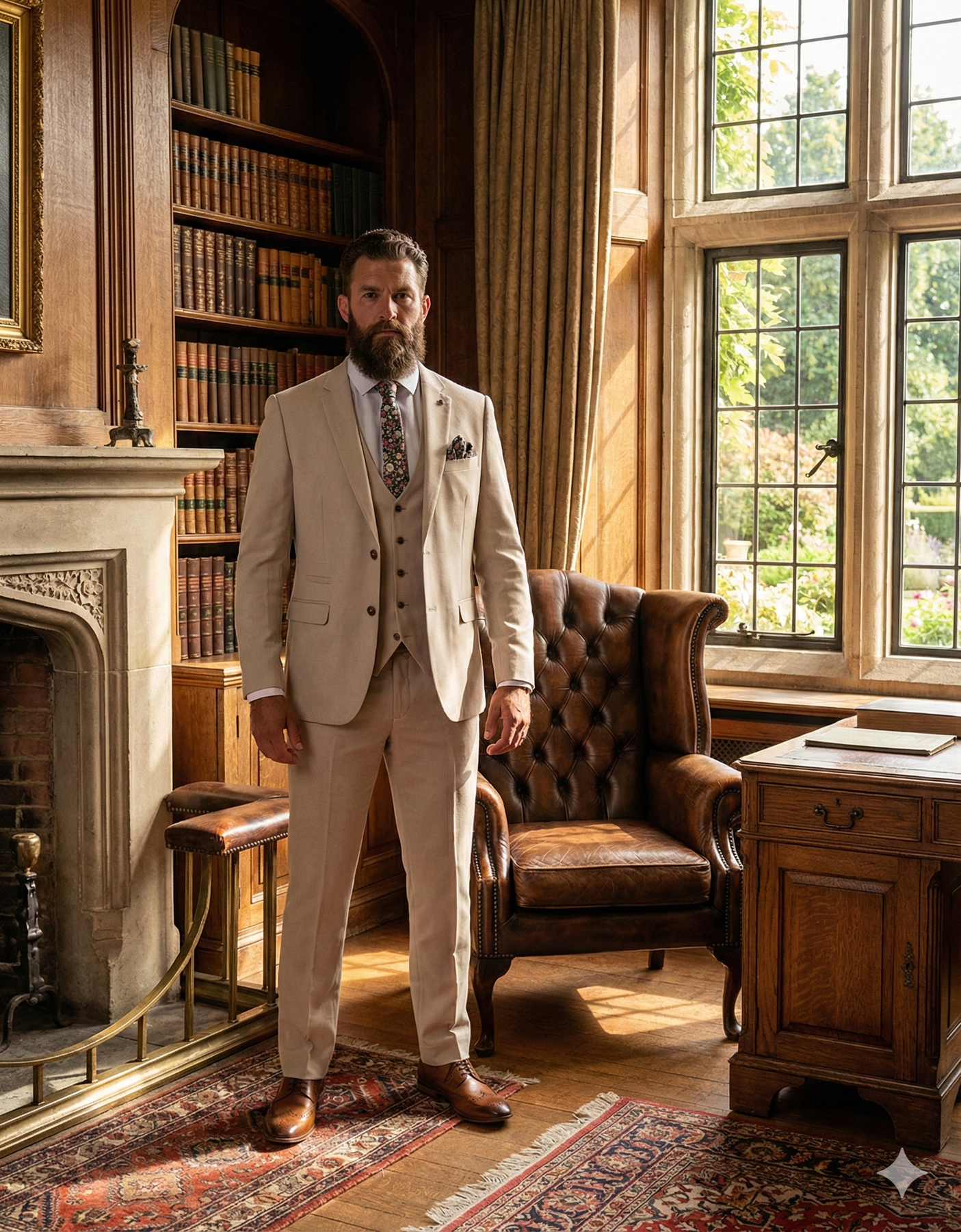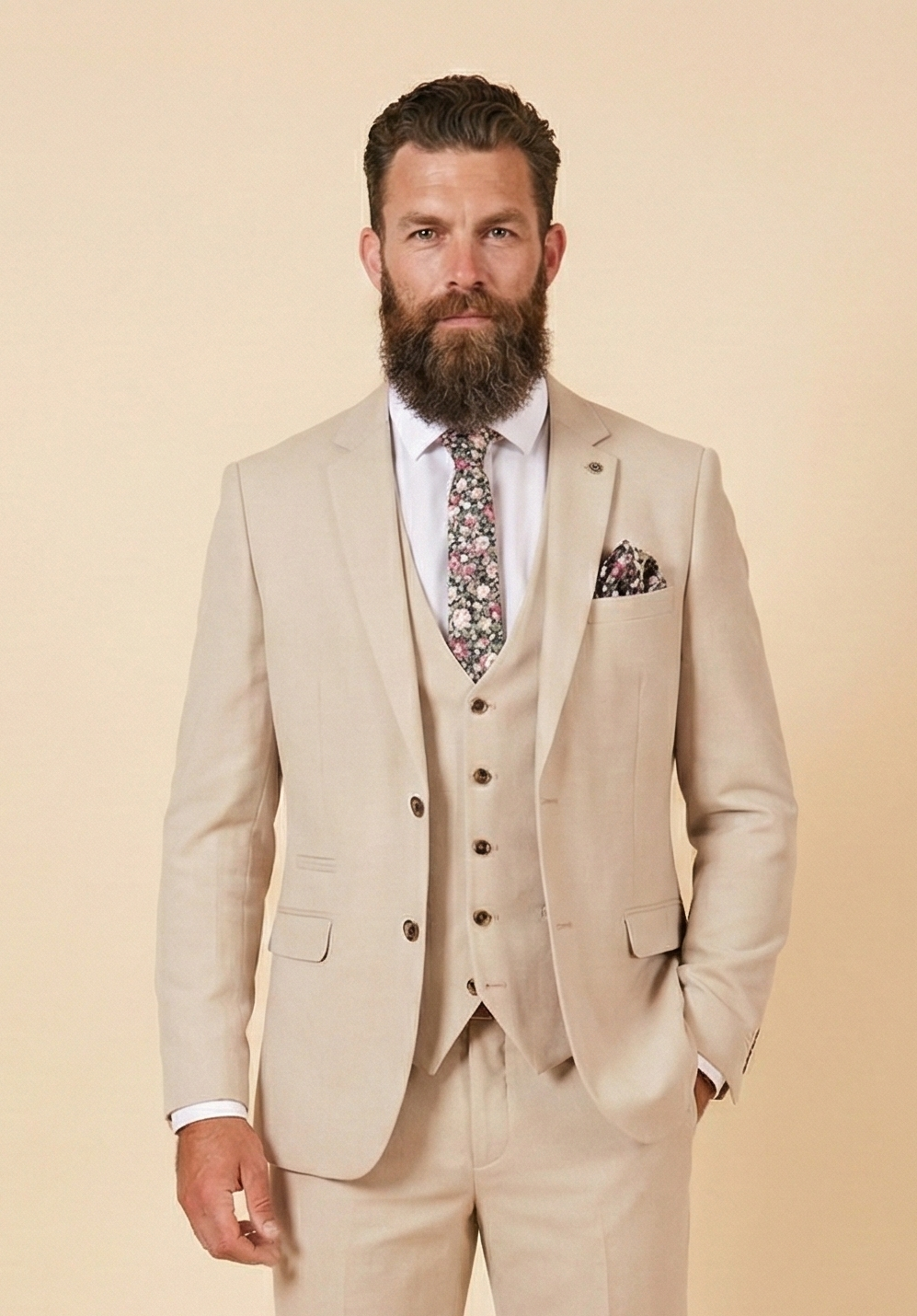 Es beginnt mit dem Gefühl. Der HM5 Stone Anzug ist nicht einfach nur leicht; er fängt das Sommerlicht ein und gibt es zurück als Selbstbewusstsein. Du trittst auf die Terrasse, oder gehst in eine jahrhundertealte Kirche, in der die Luft nach Rosen und Champagner duftet. Der stonefarbene Stoff – klar, weich, ein Statement ohne Geschrei. Dein Sakko fällt sanft über die Schultern, die Weste betont deine Silhouette, und die Hose geht wie von selbst mit dir mit.