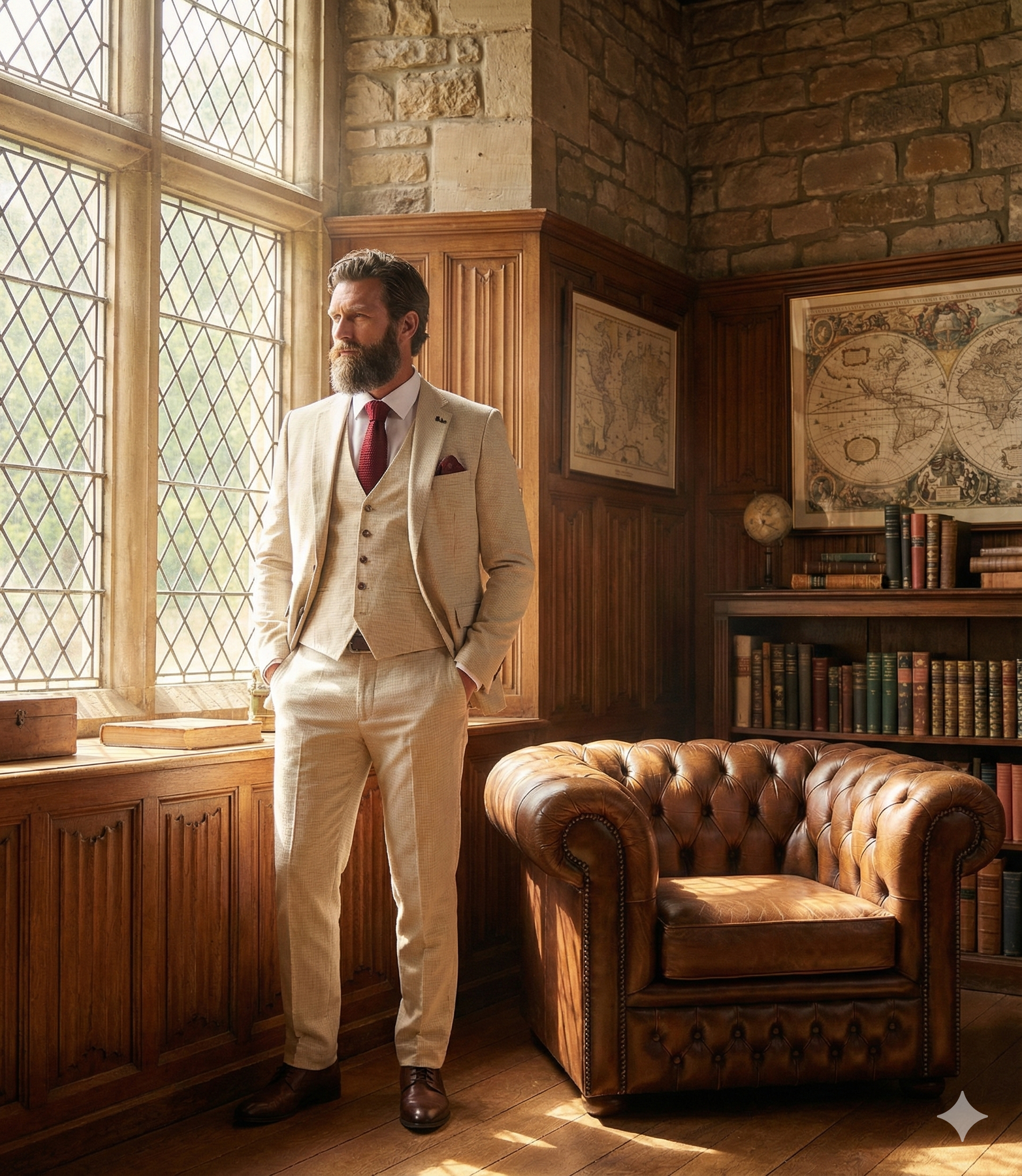 Das dezente Karomuster im Stoff ist wie ein zugeflüstertes Geheimnis – nur sichtbar für den, der genau hinsieht. Der Farbton? Nicht einfach Beige, sondern ein warmer, vielschichtiger Sandton. Als hätte der Anzug selbst schon Sommer erlebt. Als würde er Geschichten kennen von toskanischen Weinbergen, von heißen Hochzeiten unter Olivenbäumen, von Nachmittagen auf einer Dachterrasse mit Blick über die Stadt.
