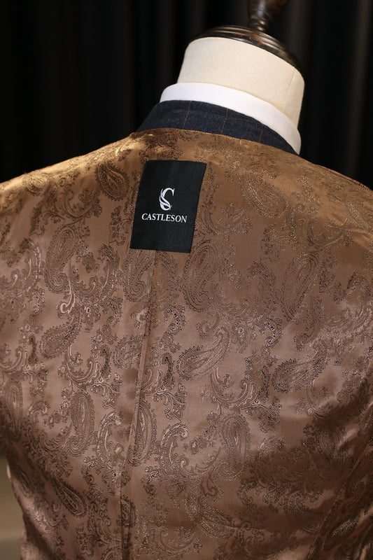 Das ist das Gefühl des CASTLESON Admiral – des dreiteiligen Navy-Check-Anzugs, der klassische Eleganz mit moderner Bravour nahtlos vereint. Kein Detail ist hier dem Zufall überlassen. Jedes Element – von den Samt-Akzenten bis hin zum orangefarbenen Karomuster – ist eine subtile Anspielung auf den selbstbewussten Gentleman, der am Abend noch ein gutes Gespräch beginnt, während das Feuer sanft im Marmorkamin knistert.