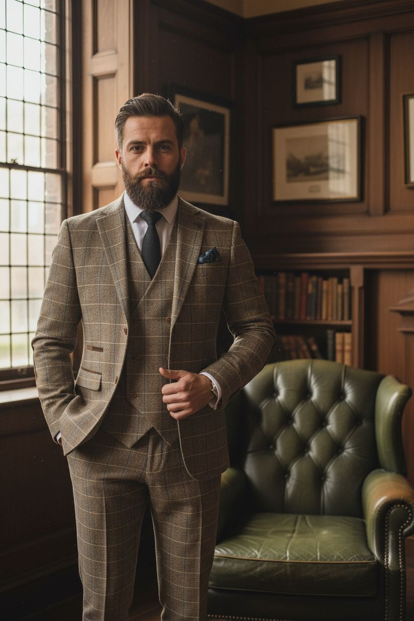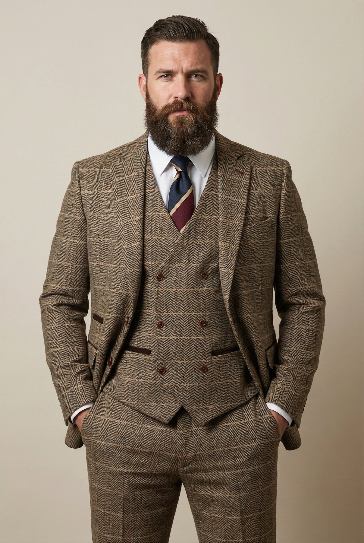 Auf den ersten Blick erinnert dieser Anzug an klassischen Tweed – man denkt an englische Herrenhäuser, Rauchzimmer und einen schweren Portwein. Doch lass dich nicht täuschen: Der Stoff ist eine raffinierte Mischung aus 10% Wolle und 90% Polyester. Das Ergebnis? Der Look von authentischem Tweed, aber ohne das schwere, steife Gefühl.