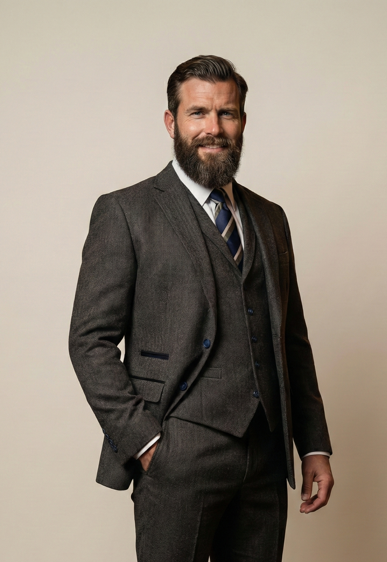 Auf den ersten Blick strahlt dieser Anzug klassische Eleganz aus: eine subtile Fischgrätstruktur, tiefblaue Knöpfe und eine Weste, die jede Bewegung akzentuiert. Doch die wahre Magie liegt im Stoff: 100% hochwertiges Polyester. Keine Wolle, kein Kratzen, kein Aufwand.