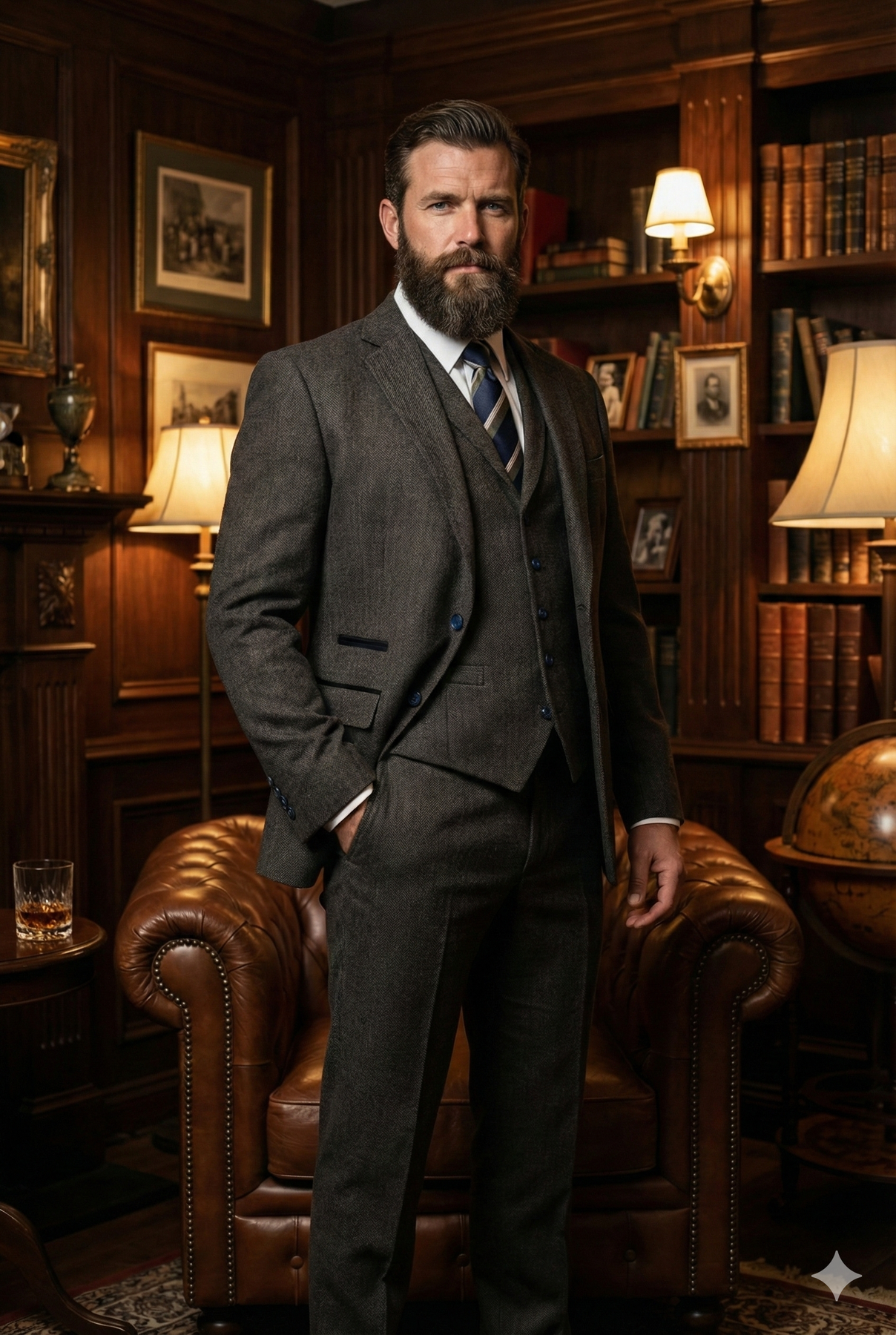 Ein Raum voller Holz, der Duft alter Bücher und frisch polierter Lederschuhe. An der Wand eine Uhr, die das Tempo des Tages verlangsamt. Du greifst zu deinem Whiskyglas – schweres Kristall, weiches Bernstein. Heute trägst du den Chief Grey. Und das spürst du.
