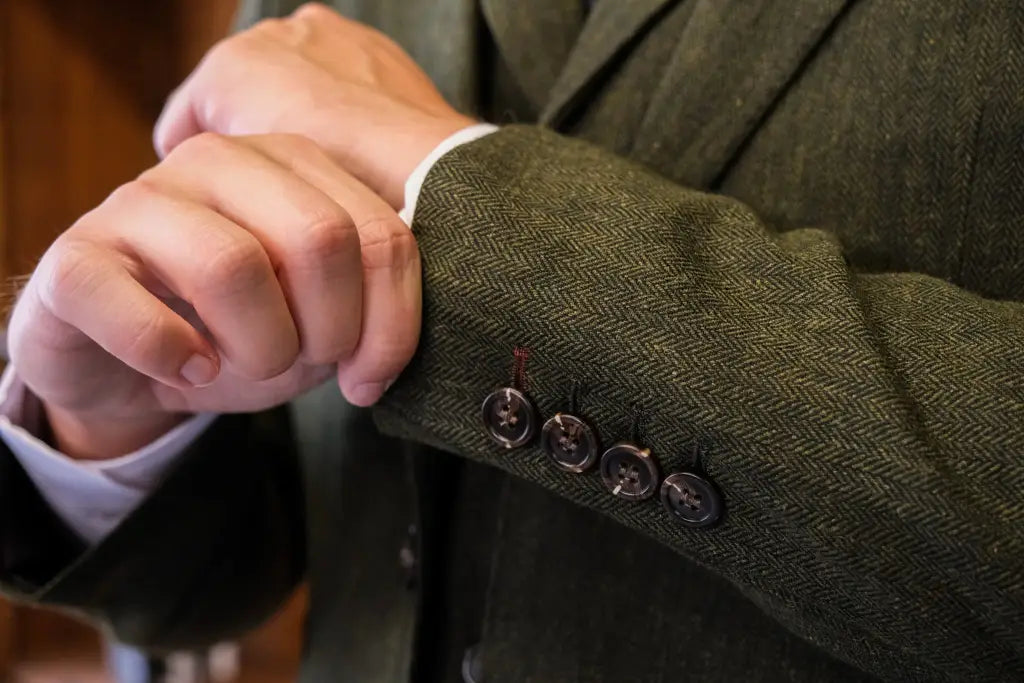 Das Erste, was auffällt, wenn du den CASTLESON Chief – Gentleman Moss Tweed anziehst, ist die Qualität des Materials. Der Stoff, eine edle Mischung aus 70% Polyester und 30% Wolle, vereint Robustheit mit Komfort. Die Webstruktur des Tweeds ist dicht genug, um im Herbst und Winter Schutz zu bieten, aber leicht genug, um ihn im Frühling oder sogar an einem warmen Sommertag zu tragen. So bleibst du zu jeder Jahreszeit bequem gekleidet. Wolle verleiht dem Anzug sein atmungsaktives, natürlich luxuriöses Gefühl, während Polyester für zusätzliche Haltbarkeit und ein gepflegtes, glattes Erscheinungsbild sorgt. Das Ergebnis ist ein Anzug, den du genauso gut zu einer Hochzeit wie zu einer wichtigen Präsentation im Büro tragen kannst.