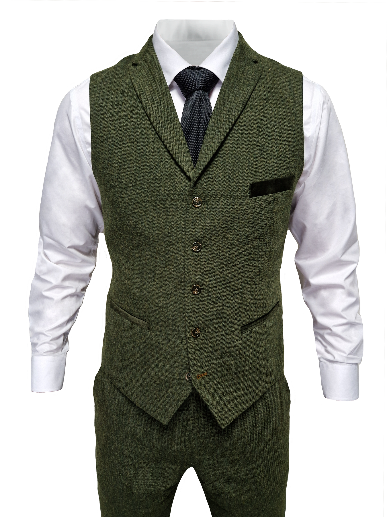 Braune Knöpfe, ein einreihiger Verschluss und ein Notch-Lapel sorgen für einen klassischen Look, während der doppelte Rückenschlitz dem Sakko eine moderne Note verleiht. Die Weste ist ebenfalls einreihig und mit verstellbaren Riemen ausgestattet, sodass du immer eine perfekte Passform erhältst. Die Hose hat einen sauberen Reiß- und Knopfverschluss sowie praktische Seiten- und Gesäßtaschen. Jedes Teil des Anzugs ist darauf ausgelegt, nicht nur schön, sondern auch funktional zu sein. Du merkst es an allem — vom leichten Hinzufügen eines Einstecktuchs bis hin zur Bewegungsfreiheit während eines langen Tages.