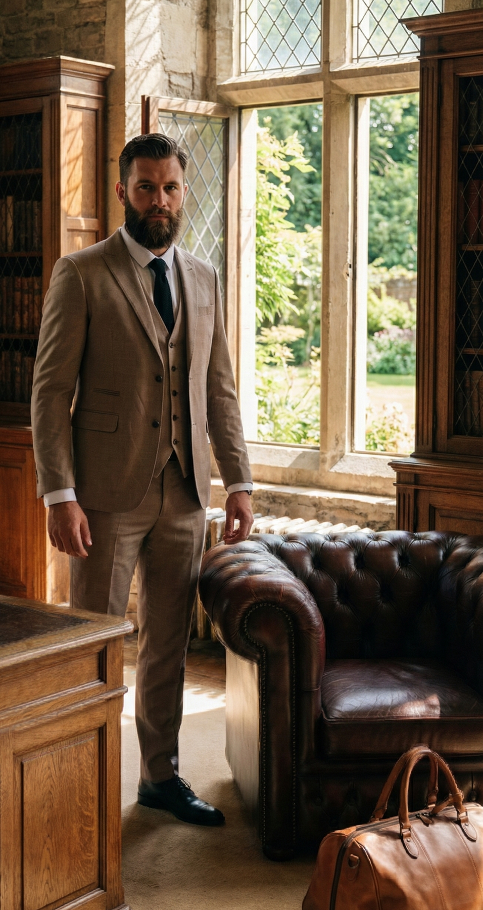 Was du trägst, ist kein gewöhnlicher Anzug. Das ist der Major von CASTLESON. Ein dreiteiliges Meisterwerk, das nichts schreien muss, um Eindruck zu machen. Der glatte, beigefarbene Stoff fängt das Tageslicht auf eine beinahe unwirkliche Weise ein. Sanft, raffiniert, selbstbewusst. Das ist die Uniform eines Mannes, der weiß, wer er ist. Und was er ausstrahlt.