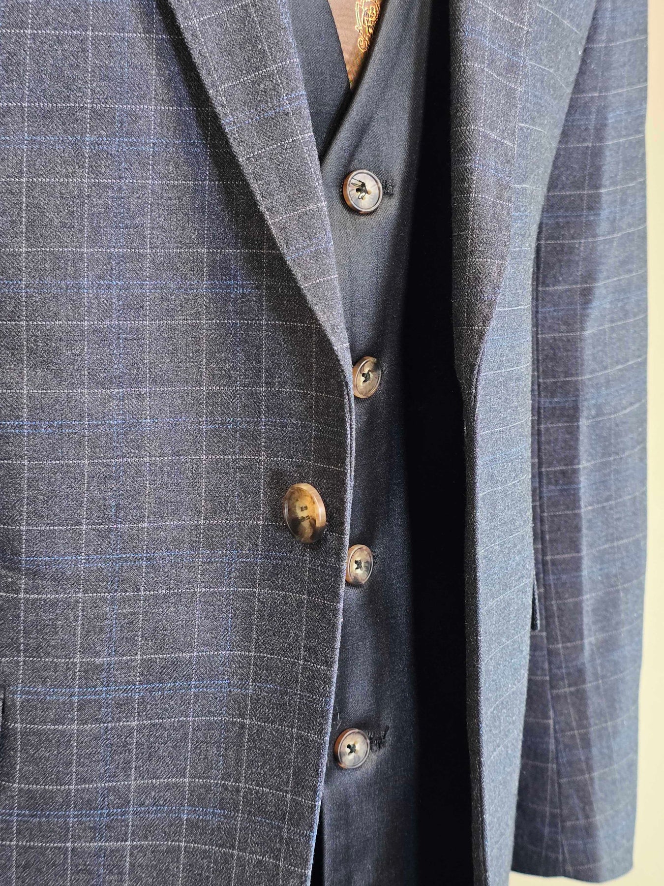 Wusstest du, dass du diesen Anzug auch in Einzelteilen bestellen kannst? So kannst du das Sakko, die Weste und die Hose in verschiedenen Größen bestellen, sodass der Anzug noch besser zu dir passt! Hier sind die Einzelteile:
