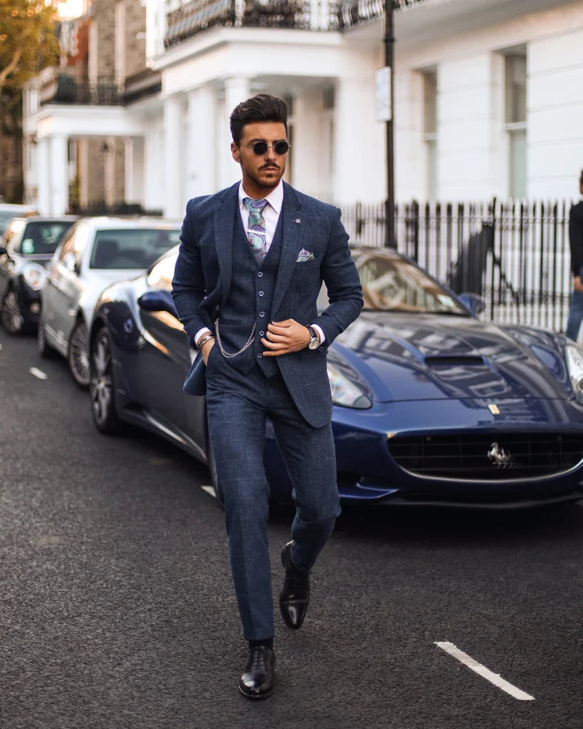 Fühle die Knöpfe: schwer und zuverlässig, wie die Tür eines englischen Herrenclubs. Der Tweed hat Charakter; jeder Faden scheint seine eigene Geschichte zu erzählen. Die Weste verleiht eine Prise Raffinesse – jene typische Gentleman-Note, mit der du mühelos Eindruck machst. Das Sakko atmet Tradition, und die Hose sitzt wie maßgeschneidert. Gemeinsam bilden sie ein Ensemble voller Geschichten.
