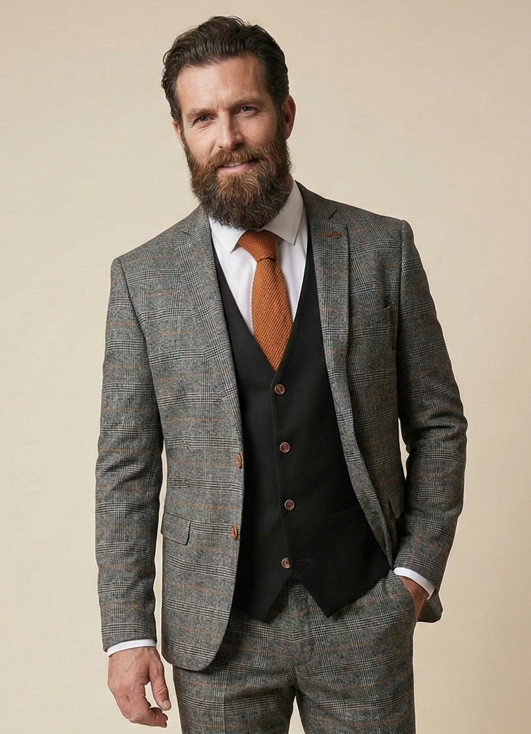 Das ist kein gewöhnlicher Anzug. Der dreiteilige Jenson Grey Anzug ist eine kraftvolle Kombination aus markantem Grau, einem dezenten Karomuster und einer tiefschwarzen Weste, die dir sofort ein scharfes Silhouette verleiht. Du spürst es: Dieser Anzug ist für Männer gemacht, die mutig ihre Entscheidungen treffen. Die Struktur des Stoffes verleiht Tiefe, der klassische Look wird durch den modernen Schnitt und den Farbkontrast direkt zeitgemäß. Mit einer bordeauxroten Krawatte, einer schwarzen Fliege oder einem auffälligen Einstecktuch hebst du das Gesamtbild mühelos auf ein neues Level.