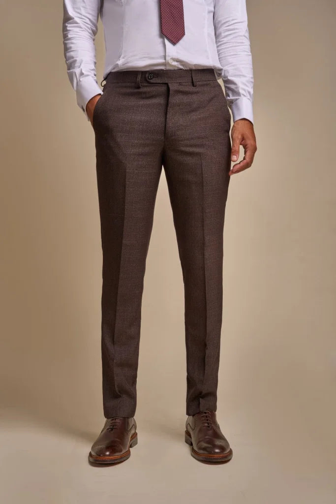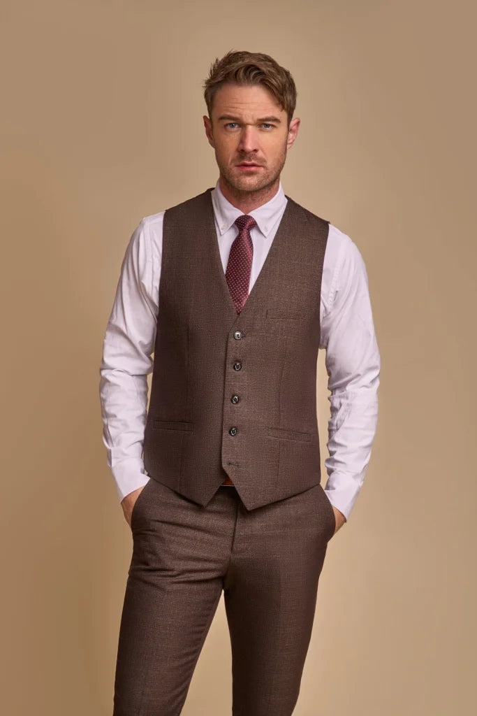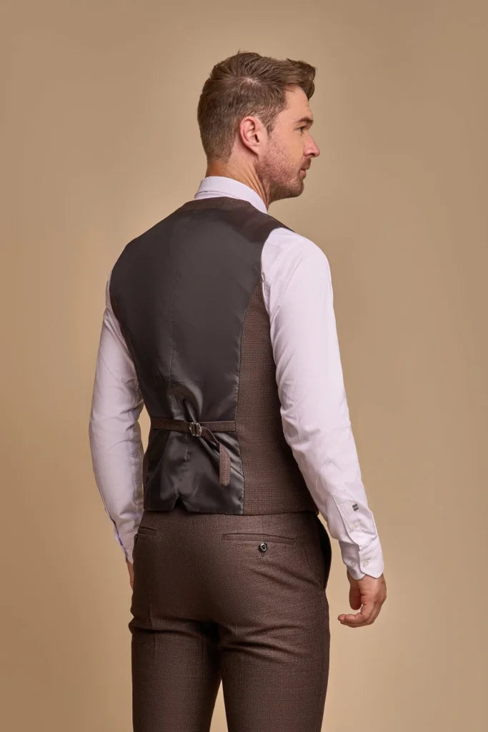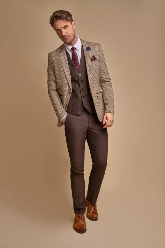 Um das Ganze abzurunden, hat Cavani sich entschieden, den Anzug mit einem auffälligen Innenfutter zu versehen. Um den Anzug komplett zu machen, hat Cavani sich dafür entschieden, den Elwood-Sakko mit der schönen Caridi Brown für die Weste und die Hose zu kombinieren!