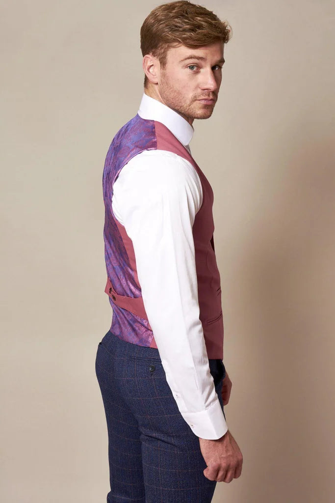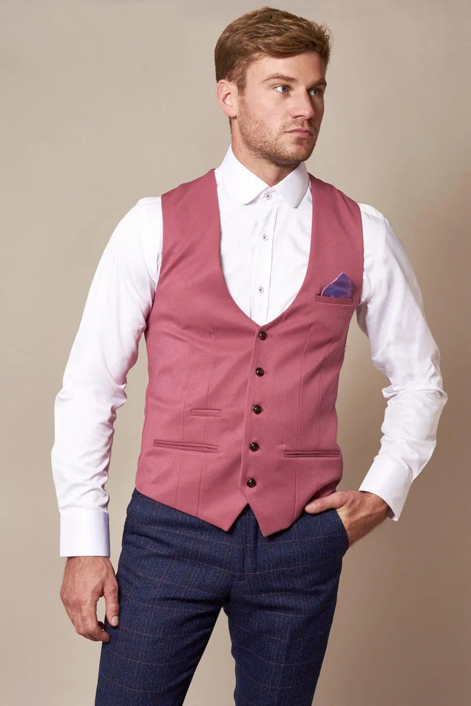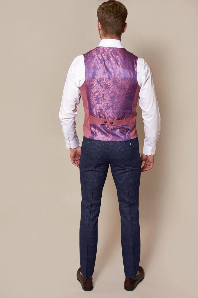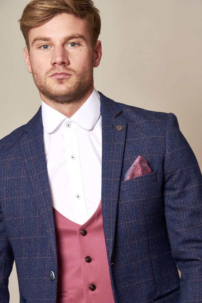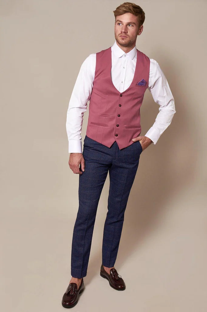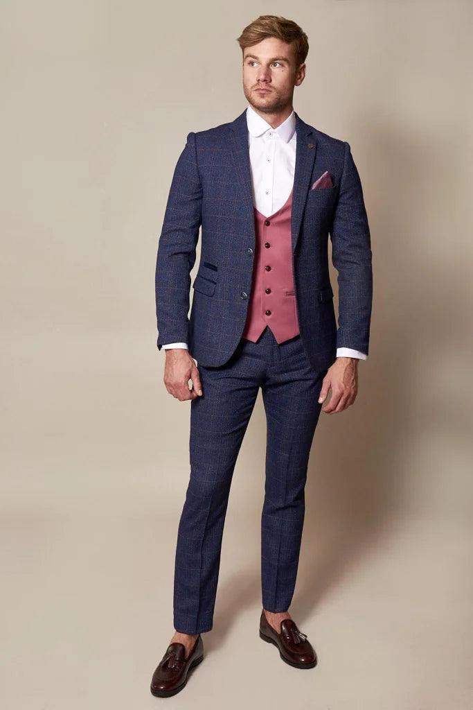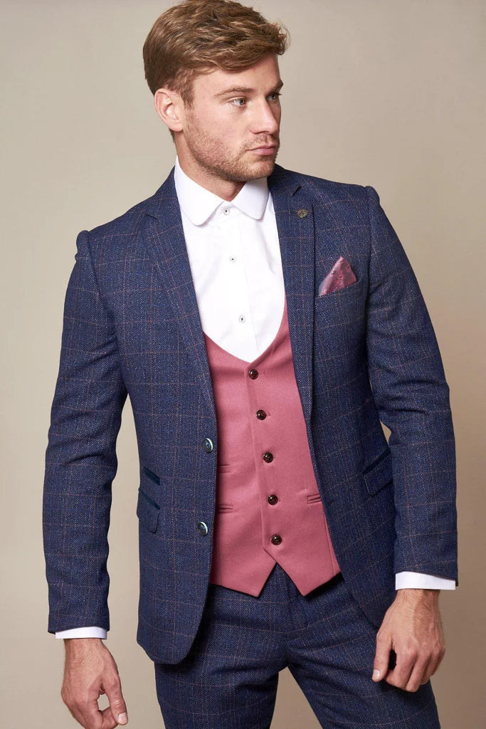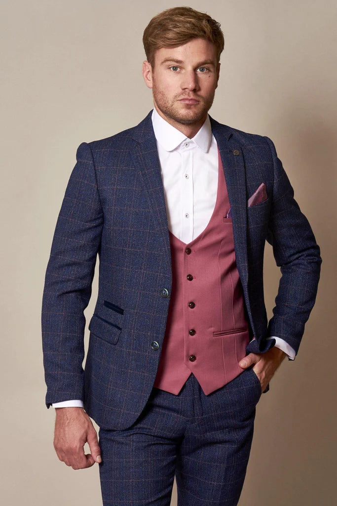 Suchst du einen schicken dreiteiligen Anzug, der die Blick auf sich zieht? Dann ist dieser Anzug genau das Richtige für dich. Der Anzug besteht aus einer Hose und einem Sakko in Harry Blau und einer Weste in der Farbe Kelly Pink. So entsteht ein reizvoller Kontrast. Harry-Blau besitzt ein Karomuster, während die Weste einfarbig ist. So passt beides perfekt zusammen