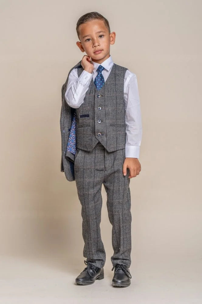 Dieser grau karierte Kinderanzug von Cavani ist der perfekte Anzug, um cool und adrett zugleich auszusehen. Der Anzug ist für alle Jahreszeiten geeignet, wird aber aufgrund des Tweed-Stoffes hauptsächlich im Frühjahr, Herbst und Winter getragen. Jacke, Weste und Hose lassen sich auch gut kombinieren, wenn Sie das klassische Outfit Ihres Sohnes gegen ein legeres tauschen möchten. Die Weste ist mit einer einreihigen Knopfreihe und einem hübschen, passenden Rücken ausgestattet.