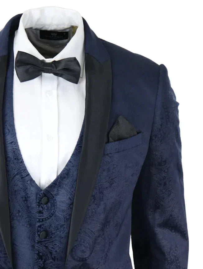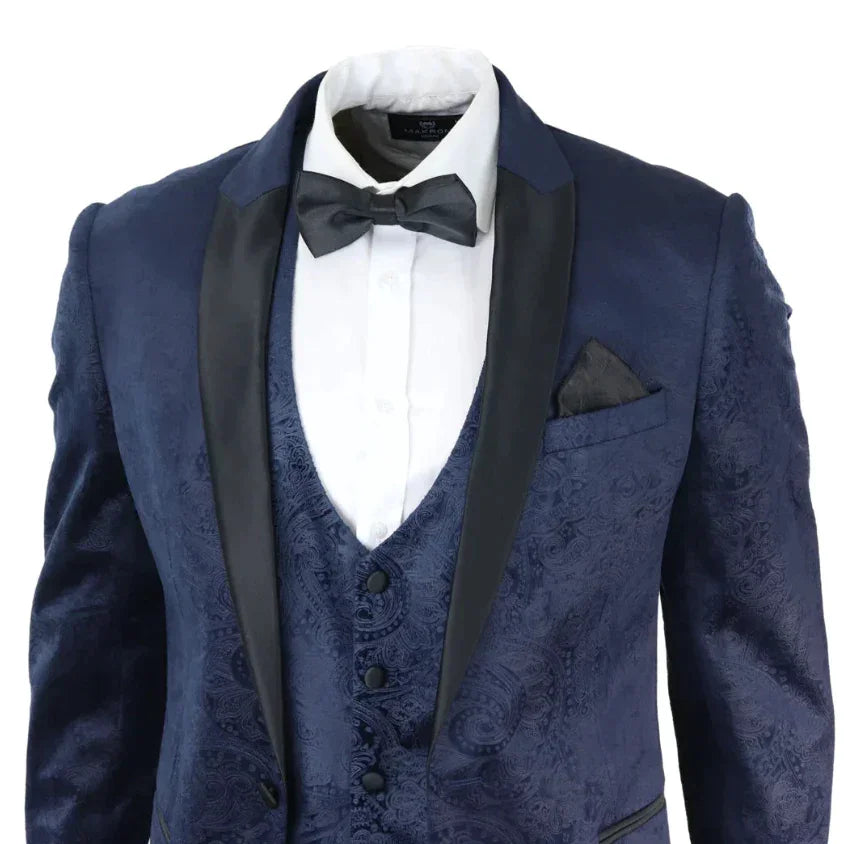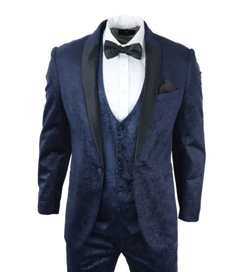 Lassen Sie uns über das stilvollste, zeitlose Outfit sprechen - der Smoking in Navy mit Paisley-Samt-Stoff. Dieses Outfit hat alles, was Sie für jede Veranstaltung benötigen, von Hochzeiten über Galas bis hin zu eleganten Abendessen.